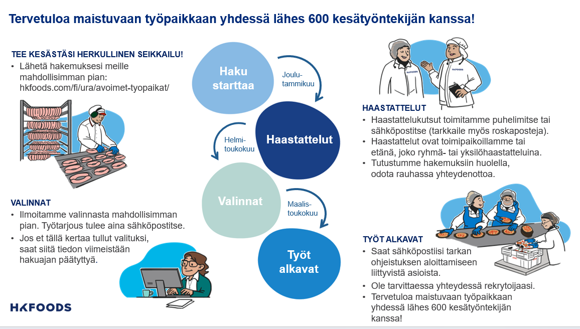Kesän 2026 kesätyöpaikat avautuvat hakuun vuodenvaihteessa. Ota siis sivut seurantaan! Lue lisää avoimista kesätyöpaikasta täältä ja hae mukaan maukkaaseen työyhteisöömme!