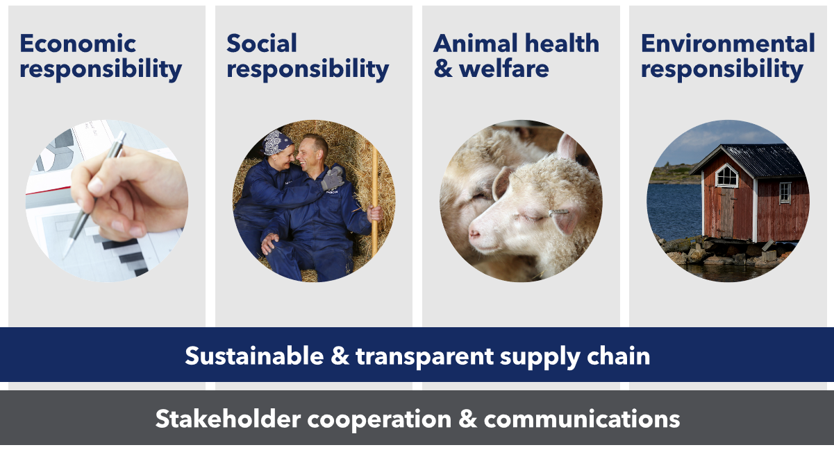 Our corporate responsibility work focuses on four areas: animal health and welfare, environmental responsibility, social responsibility and economic responsibility. As the leading Nordic food company, we are committed to being the world's best both in animal care and in reducing our environmental impact. We take the wellbeing of our communities and people seriously.