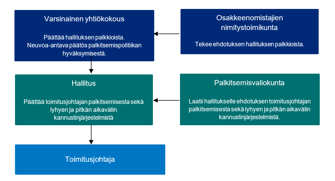 Osakkeenomistajien nimitystoimikunta antaa hallituksen palkkioita koskevan ehdotuksen varsinaiselle yhtiökokoukselle, kun taas hallitus on vastuussa toimitusjohtajan palkitsemiseen ja kannustimiin liittyvästä päätöksenteosta hallituksen palkitsemisvaliokunnan tekemän ehdotuksen perusteella. Hallituksen ja toimitusjohtajan palkitsemista koskeva päätöksentekoprosessi, joka on kuvattu kaaviossa alla, varmistaa päätösten läpinäkyvyyden.