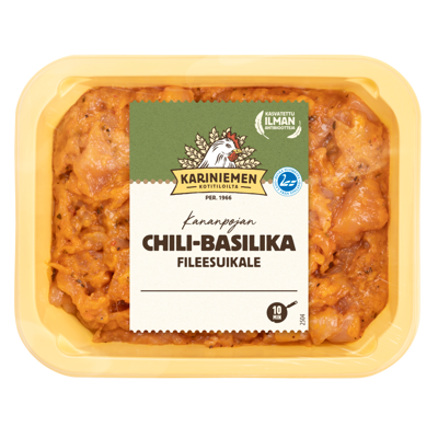 Kariniemen Kananpojan fileesuikale chili-basilika on pintamaustettu, maukas ja monikäyttöinen arjen helpottaja aasian tvistillä. Fileesuikaleesta teet nopeasti monenlaisia maistuvia kanaruokia kuten esimerkiksi kanapastaa. Kariniemen Kananpoika on aina suomalaista, ilman antibiootteja kasvatettua kanaa. Tuotteella on "Hyvää Suomesta" -merkki.