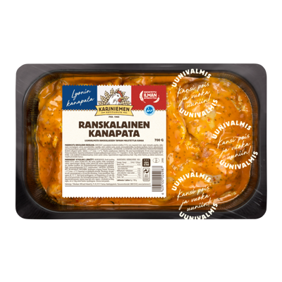 Kariniemen Kananpojan Uunivalmis ranskalainen kanapata Lyonin tapaan on kanaruokien klassikko. Uunivalmiissa kartonkirasiassa kanapata kypsyy vaivattomasti. Lisää pataan kirsikkatomaatteja, kypsennyksen loppuvaiheessa crème fraîchea ja nauti perunoiden, pastan tai riisin kera. Kariniemen Kananpoika on aina suomalaista, ilman antibiootteja kasvatettua kanaa. Tuotteella on "Hyvää Suomesta" -merkki.