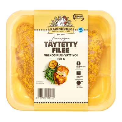 Kariniemen Kananpojan täytetty filee valkosipuli-yrttivoi on rapeaksi pintamaustettu ja täytetty maukkaalla valkosipuli-yrttivoilla. Kypsennä rapeaksi pannulla tai uunissa. Airfryerilla kypsennettäessä on hyvä käyttää leivinpaperia. Pakkauksessa on 2 täytettyä fileetä.