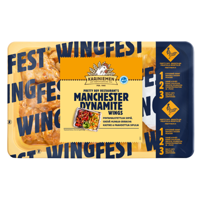 Kariniemen Kananpojan Wingfest® -sarjan Wings Manchester Dynamitessa on pintamaustettujen siipien lisäksi kypsän tuotteen viimeistelyyn kastike ja pussi paahdettua sipulia. Täydellisen makunautinnon salaisuus piilee Pretty Boy Wingery -ravintolan Manchester Dynamite-, iskevässä hunaja-sriracha-kastikeessa.