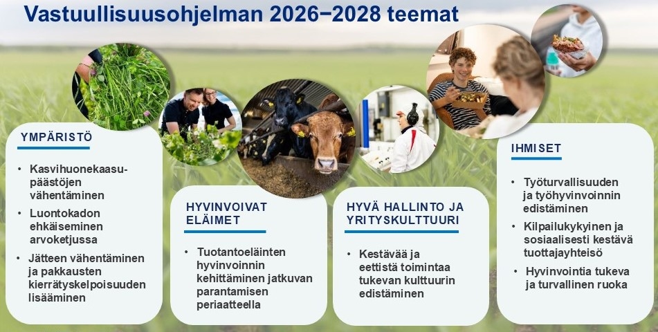 HKFoodsin vastuullisuusohjelma 2026–2028 keskittyy strategiamme, liiketoimintamme ja sidosryhmien kannalta olennaisimpiin vastuullisuusteemoihin. Painopistealueet ovat ympäristö, ihmiset, eläinten hyvinvointi sekä hyvä hallinto ja yrityskulttuuri.