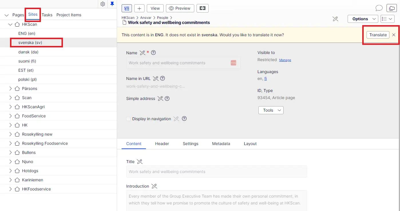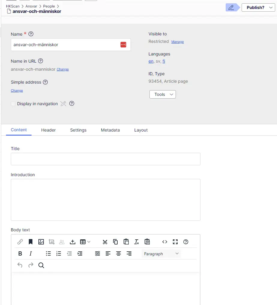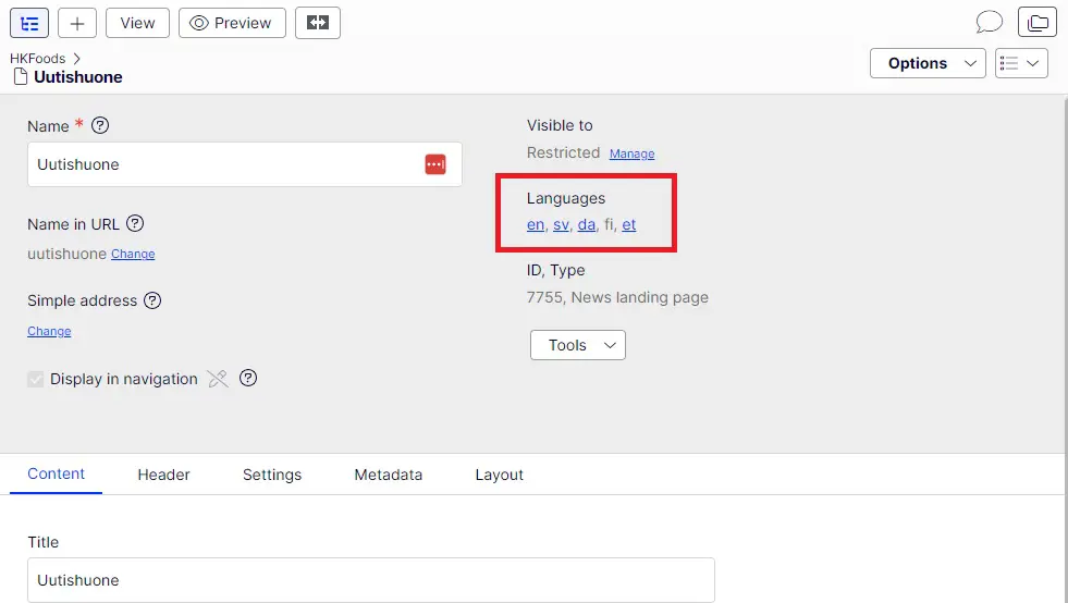 - If however there are fields that in gray and not possible to edit, it means those fields are similar in all language versions and can be only edited in the original language the first version of the page is created aka English or Finnish.