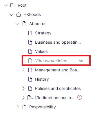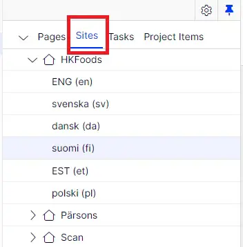 To know which language is the active in the CMS (to which language versions you are logged in), you can check this from the CMS from the left navigation pane. In the example below it's clear the we're in the English version. In the middle though there is a page that is only available in Swedish.