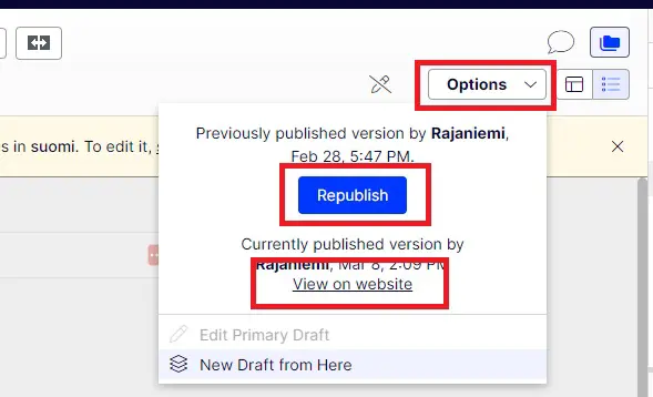 If you want to publish and older version instead of the current one, that is possible. Just click on the wanted version on the right pane listing and publish it normally from the top: