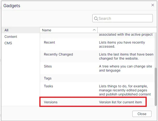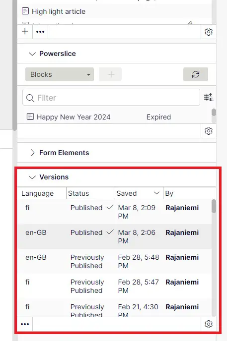 Now at the bottom of the right asset pane you should be able to see (remember scroll down enough) the version listing of the page you're working on.