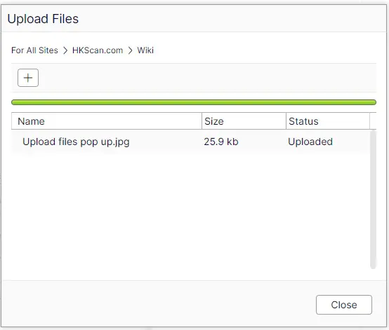 Now press Close button and the file will appear to the media file listing on the right. From there you can drag and drop to the pages or blocks you're working on.