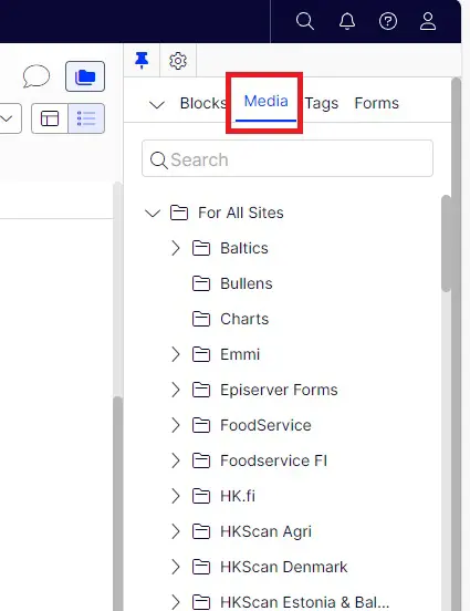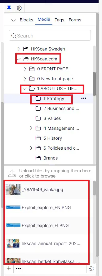 HKFoods related images go to HKScan.com media folder and to its subfolders. The subfolders have been named as much according to the site's navigation tree on the left. For example if you want to upload something to Debt investors page, in the Media tab select the folders: HKScan.com -> 3 Investors -> 2 Financials -> 1 Debt investors
