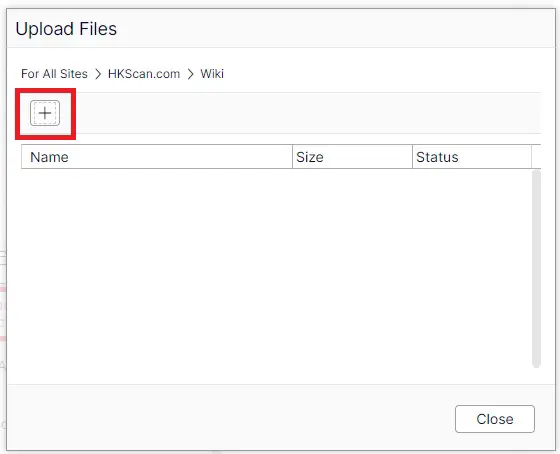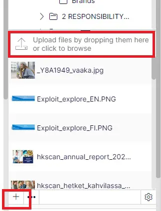 To upload media files to the right folder, you can either drag and drop the images or click the plus icon at the bottom